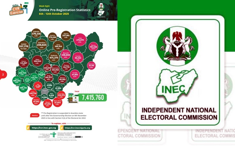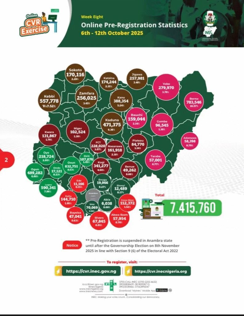 The Independent National Electoral Commission (INEC) says it has recorded a total of 7,415,760 online pre-registration in the ongoing nationwide Continuous Voter Registration (CVR) with Borno taking the lead with 783,546 registrants.