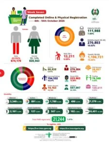 The update also revealed that as at Oct. 12, a total of 1,502,733 Nigerians have successfully completed both online and physical Continuous Voter Registration (CVR) within the seventh week of the exercise.